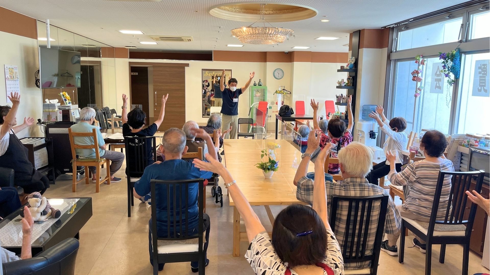訪問鍼灸の方をお呼びし、皆さんと一緒に体操をしました! 最初は首や腕の軽い体操からはじめ、徐々に複雑な動きに皆さんも真剣な顔に🔥 体操で代謝を上げることで夏バテ防止🍉複雑…